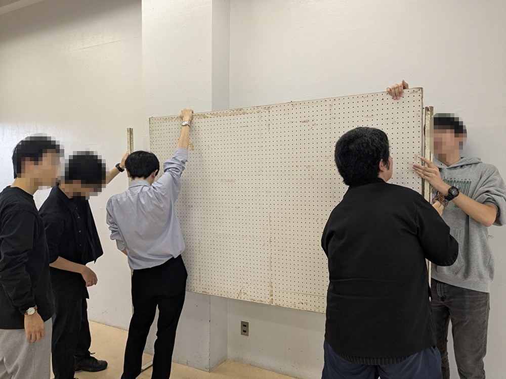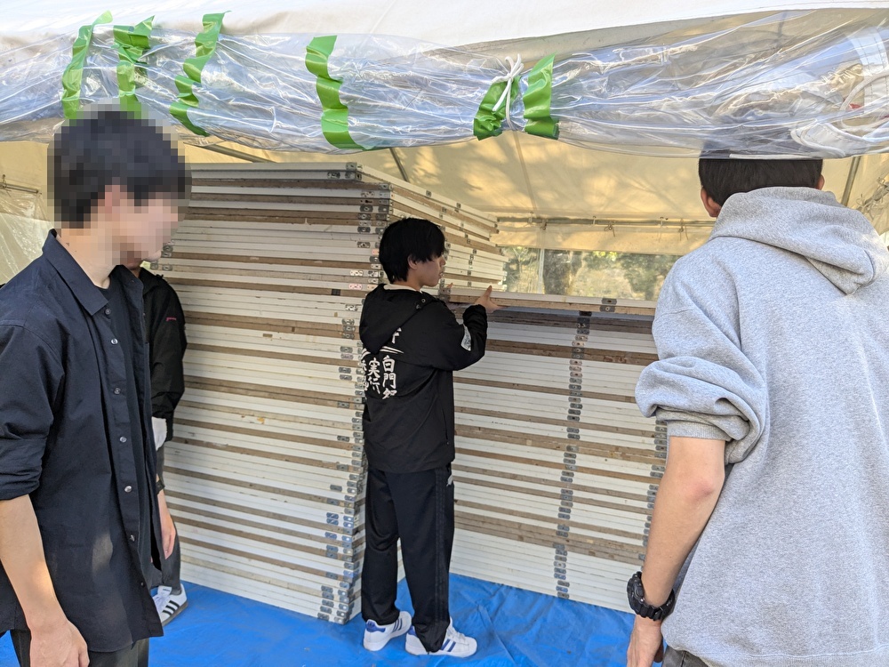椅子・机をどかし終えたら模造紙を貼るためのボードと支える柱を資材置き場まで取りに行かないといけません。
