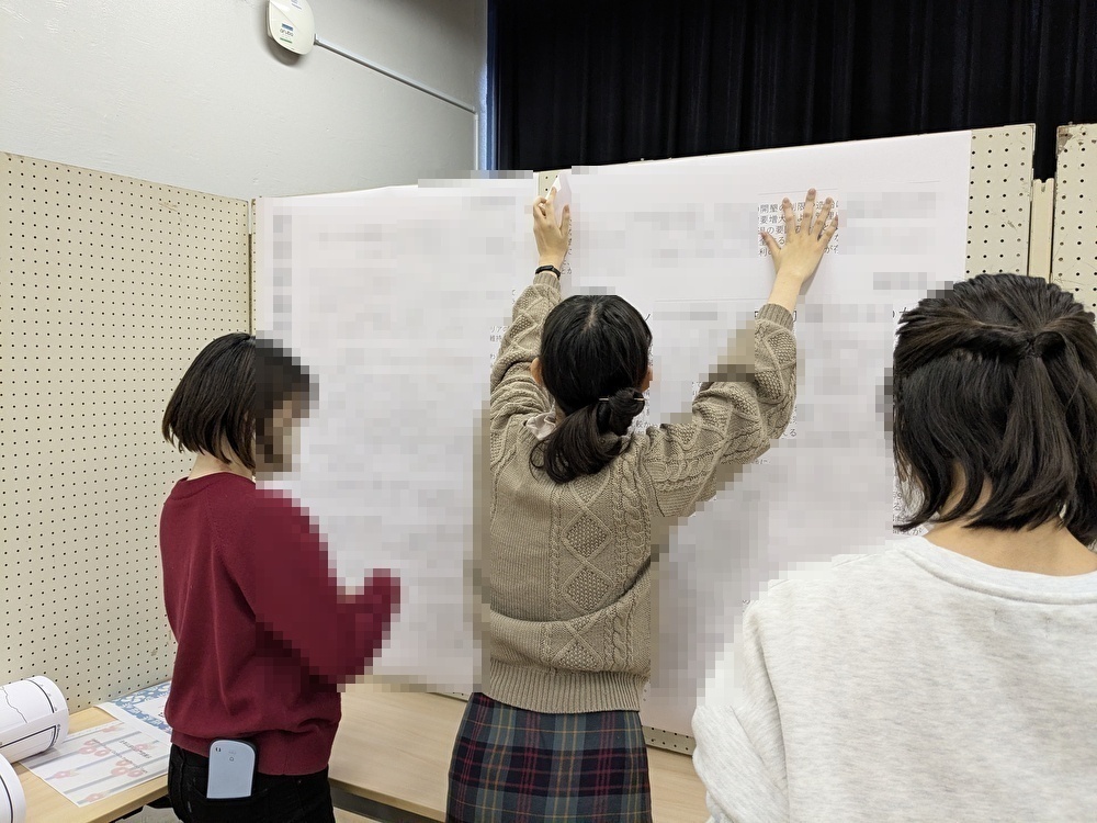 ここまで来ればもう残りは少し。組みあがったボードに展示品の模造紙を貼っていきます。