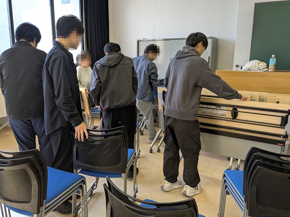 一連の流れを確認し終え、やってきたのは3551教室。すでに多くの会員が集まっていました。白門祭期間中はこの部屋が史学研の展示ブースです。しかし、教室には多くの椅子と机があります。まずはこれを脇にどかさなくてはいけません。