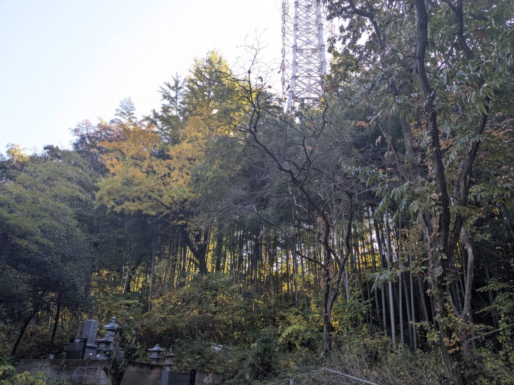 さて、中央大学明星大学駅から一駅行ったところにある多摩動物公園駅で降り、大学のほうへ向かいます。すると、かつては多くの学生たちが使っていたであろうトンネルへの入り口が見えてきました。しかし、今回の目当てはそちらではなく右側。しばらく道なりに進んでいきます。木々が道の上に覆うように生えており、快晴だというのに妙な不気味があります。もちろん、ストリートビューは使えません。GPSで大まかな位置を確認しつつ、送電線を目印に歩くこと数分。突然、日の光が差し込んできました。日光が見えるということは、誰かが木をわざわざ伐採したということです。東側に目を向けるとそこにあったのはなんと、お墓でした。