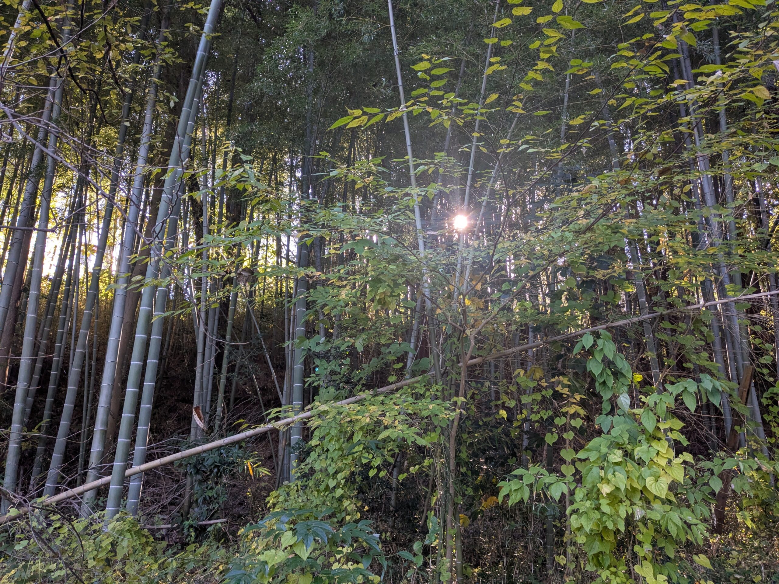 一基だけポツンと置かれています。一帯は木々がなく、手入れが行き届いている印象を受けます。そうはいっても下草は伸び放題ですし、倒れた木はそのまま放置されたままでした。藪の向こうから日光が届いていたので、近寄って見ると、急な斜面から竹が生えていました。