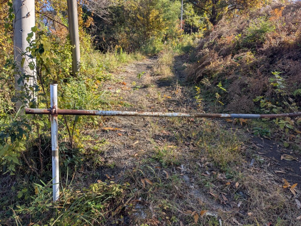 おそらく、この藪を分け入っていて斜面を登れば、最初の舗装された道につながるのでしょう。しかし、それを確かめるのは危険ですし、何より今回の目標は送電線鉄塔へ行くことです。元の道に戻り、歩いていくと衛星写真で確認した通り、Uターンするように鉄塔へ続く道があるではありませんか!しかし、私の夢はここまででした。なんと私の行く手を遮るように障害物がおかれていたのです…。