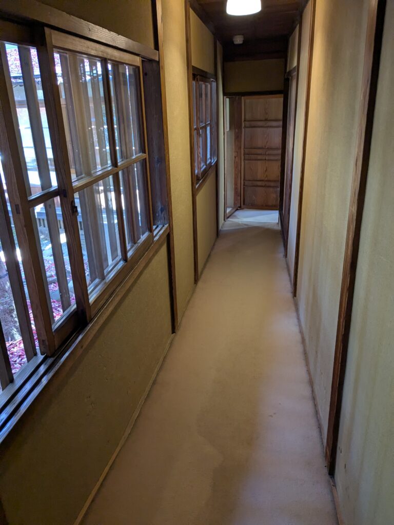 おそらくこの中に重要なものをしまっていたのでしょう。床は板張りではなく、白いカーペットのような絨毯のような何かが敷いてあります。建てられた当時からこのようなカーペットをひいていたのだとしたら、昭武のセンスに脱帽せざるを得ません。廊下は中庭に面しており、陽の光が自然と入ってくる設計になっています。屋根は床とは対照的に濃い茶色の板張りで、そこまで天井は高くありません。