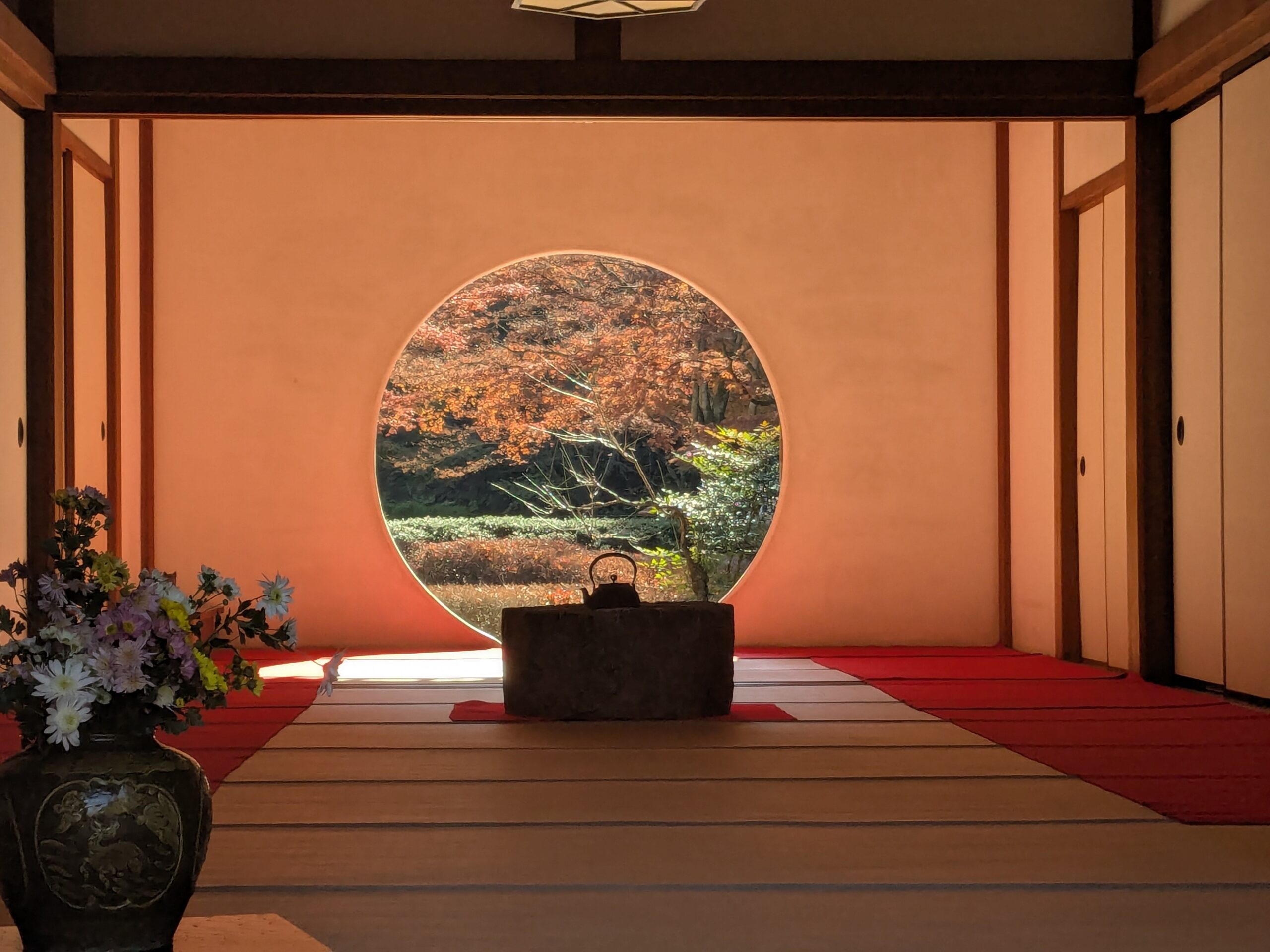 メインの道から少し外れたところにあります。先ほどの円覚寺もそうでしたが、あまり観光客の方は有名人のお墓には来ないようです。知る人ぞ知るスポットといった扱いなのでしょうか。お参りをしたあと、元の道に戻って、さらに奥へ進んでいきます。裏の庭園は紅葉と菖蒲の季節しかオープンしておらず、普段は入れません。方丈の円形の窓から覗く紅葉は大変綺麗でありました。