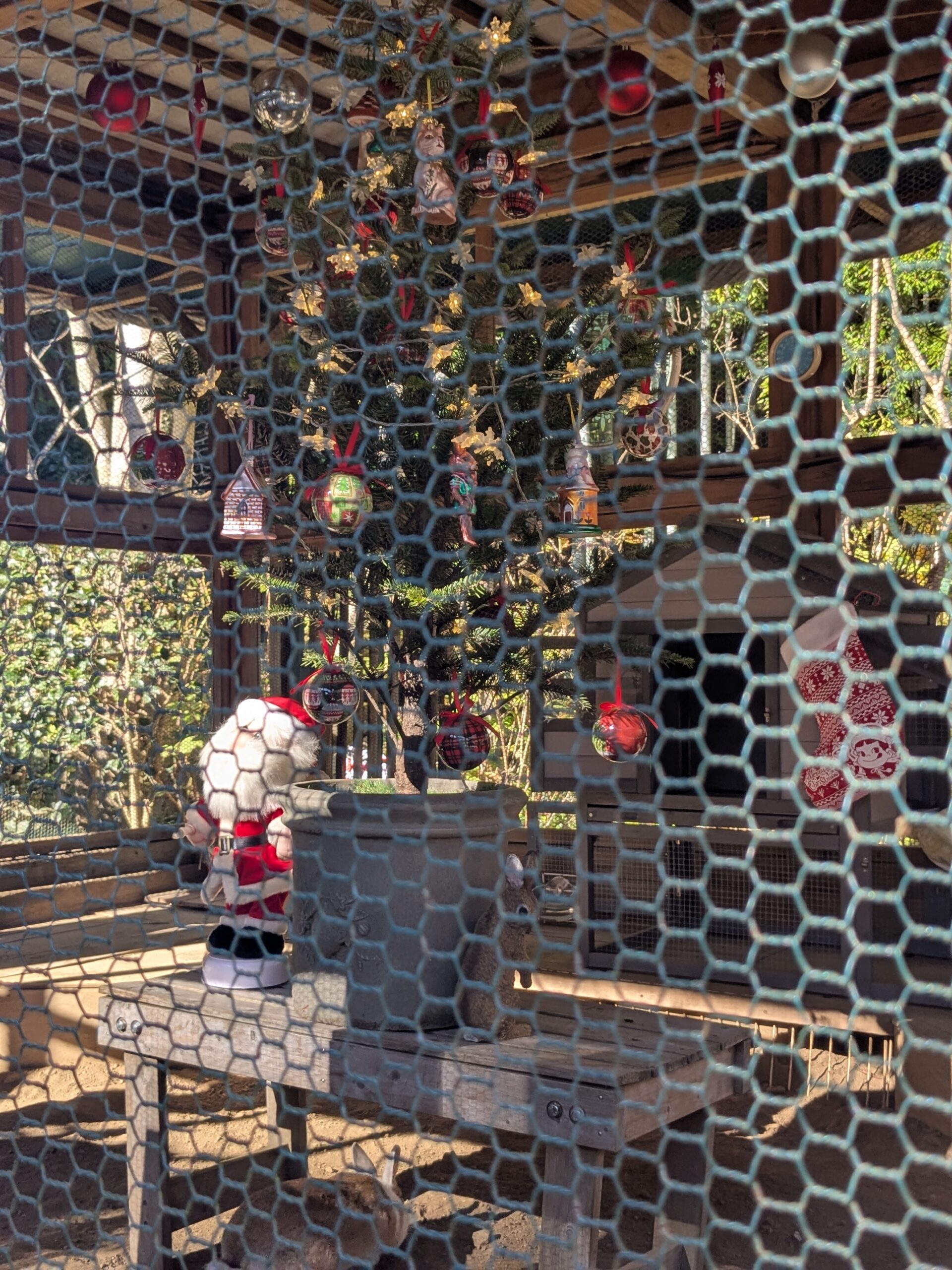 そして、次の目的地に向かおうとした瞬間、思いもよらないものが目に飛び込んできました。なんと、ウサギ小屋があったのです。しかもその中にはクリスマスツリーが飾ってあります。どういうことなの…。神仏習合の”神”は神道の神ではなく、キリスト教の神だったのかもしれません。