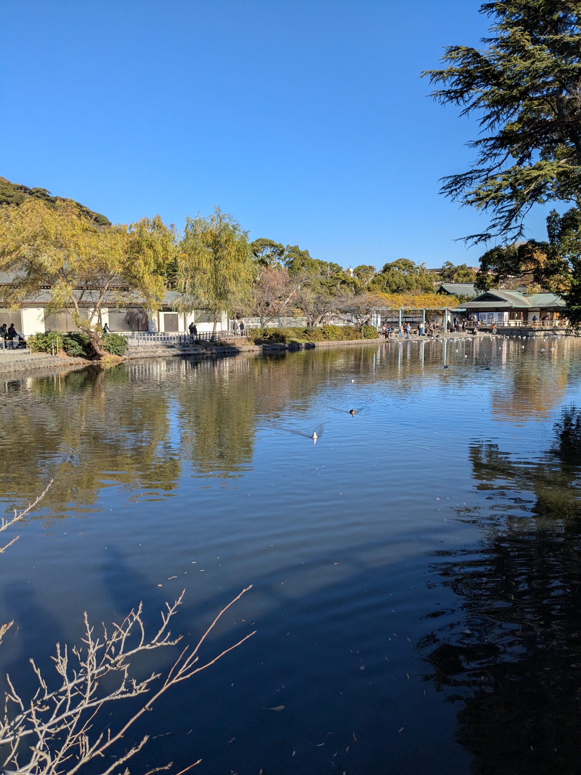 横断歩道を渡り、鳥居をくぐったら左右に大きな池が広がっていました。それぞれ源氏池と平家池と呼ばれているそうです。構造上しょうがないのでしょうが、源氏池のほうが多く人が集まっていました。