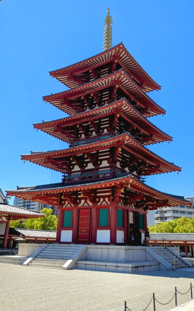 東京を離れ、本当に大阪に来たんだと実感させてくれます。照りつけるような日差しと厳しい暑さ。過酷な環境の中自分たちが最初に向かったのはこれからお世話になるホテル。荷物を預かってもらうと、最初の目的地、四天王寺へ向かいました。日本史で習った伽藍配置の通りに建物が作られていることに謎の感動を覚えます。