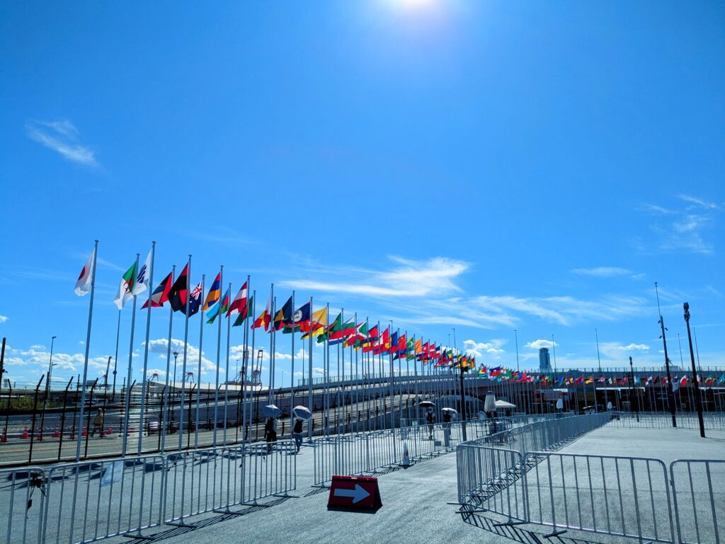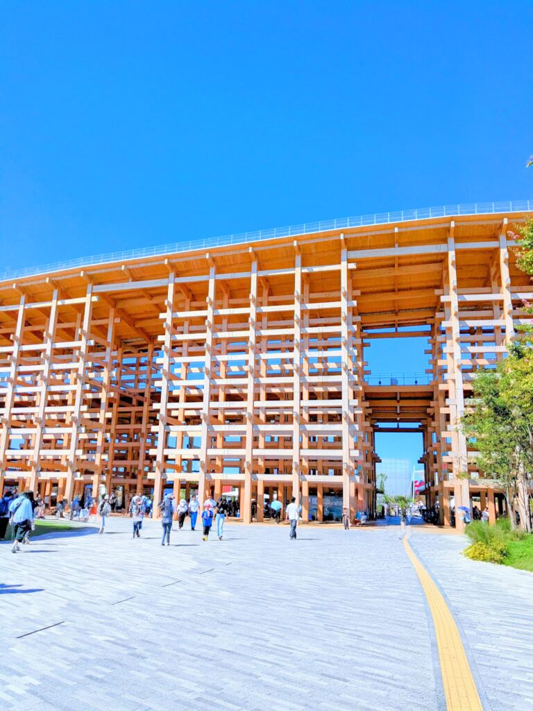 いや~遂に来たといった感じです。ですが、せっかく着いても手荷物検査のため、20分ほど炎天下の中待つことになります。待機中用の日傘を配っていたのでそこでもらっておくのがお勧めです。なんとか入場すると大屋根リングが飛び込んできます。