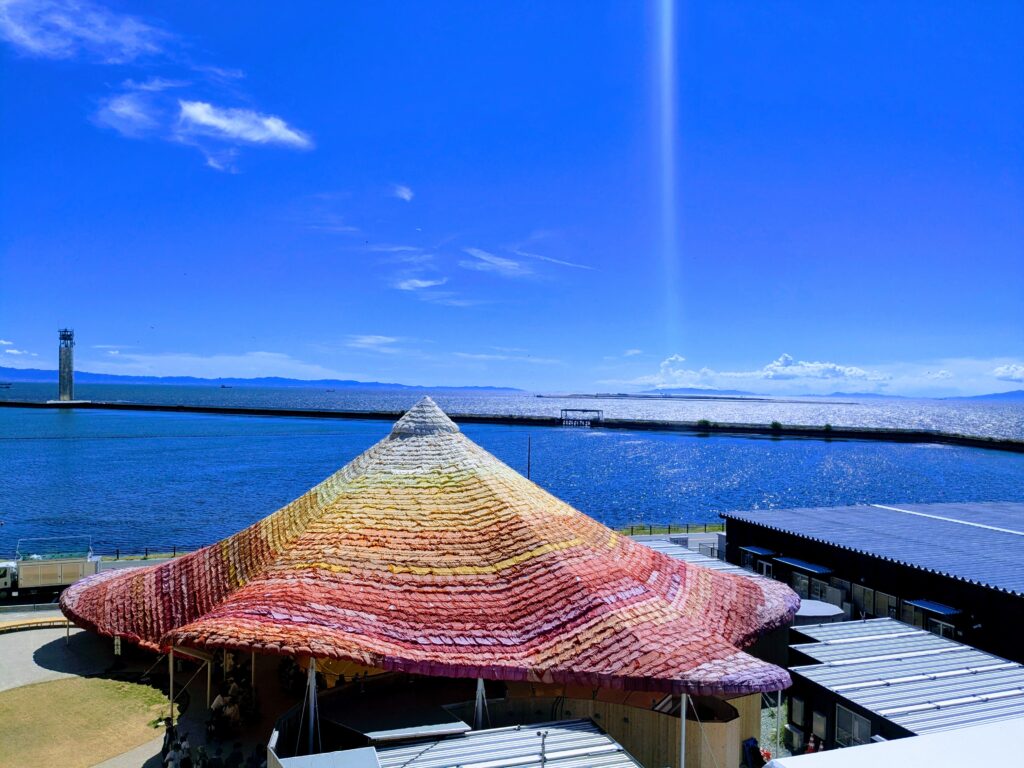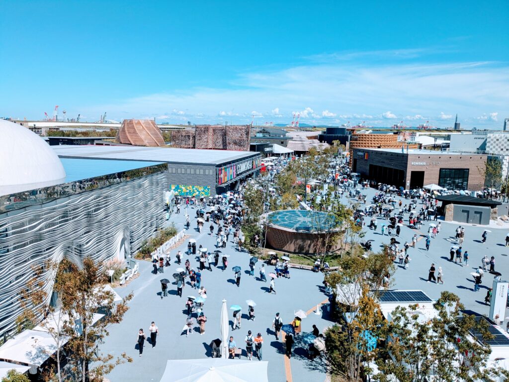 上空から見るよりもずっと大きいです。この屋根の下に待機列を並ばせてるパビリオンもあり、ただ大きいだけではなく、実用性も兼ねているようです。上に登って見る景色はこんな感じ。