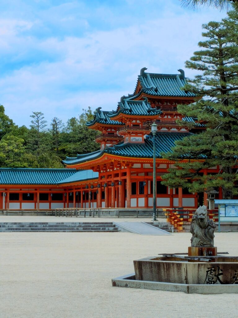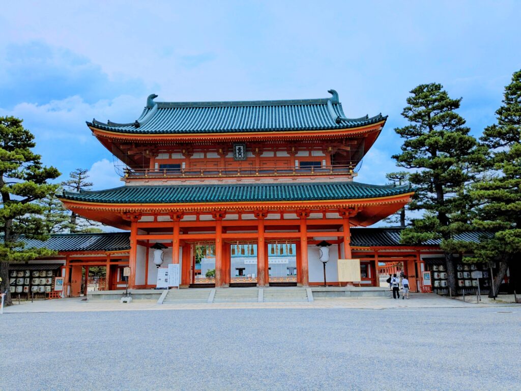 続いて向かったのは平安神宮。平安と名前がついていますが、創建されたのは1895年です。桓武天皇と孝明天皇を祀る神社で、その名前の通り平安京の朝堂院に似た広大な敷地を有しています。また、平安神宮内の蒼龍楼・白虎楼は和風建築ではあまり見られないを様式をしていました。