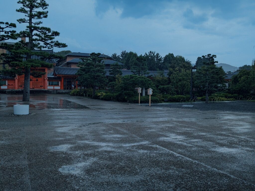 この日はあいにくのお天気で曇り空。雨が降るかもしれないという不安は当たることになりました。平安神宮を出て三十三間堂へ行ったのですが、出ることには大雨。